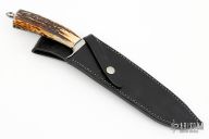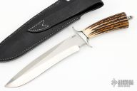 This fighter by Jim Siska features a hand rub satin finished recurve blade with sharpened top edge, .275" blade thickness and 1.663" blade depth, hidden tang construction. The handle has a mirror polished stainless steel guard and butt cap and a beautiful stag grip with black/stainless steel spacers. Comes with original black leather sheath dated '13. Excellent condition.