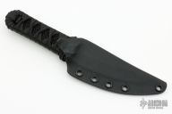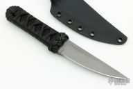 This 4" Aikuchi from Ben Tendick of B.R.T. Bladeworks features an acid etched kwaiken style blade with swedges. .179" Blade stock 1.008" Blade Depth. The handle is comprised of a Turk's head bolsters and epoxy soaked tsuka wrap over hemp cord underwrap and a hammered titanium menuki. Includes kydex sheath. Excellent condition. Includes C.O.A.