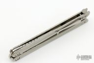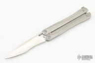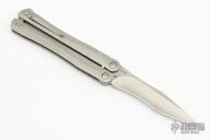 This Balisong from Brous Blades features a satin finished clip point recurve blade with notched thumbrest. The handle is comprised of a bead blast finished stainless steel frame over barrel spacers, stainless steel tip up pocket clip. Numbered #372/500. Includes padded vault style case and COA. Excellent condition.