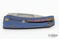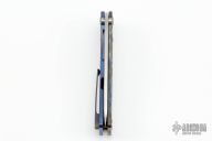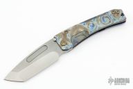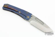 This Slim Midi Marauder from Medford Knife and Tool features a stonewashed drop point tanto blade with thumb stud and fullers. The handle is comprised of a milled and anodized titanium frame with tip up clip over a satin finished stainless steel spacers. Excellent detent, lockup, and seating. Original hard case and COA dated June 3, 2022. Excellent condition.