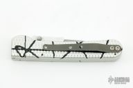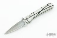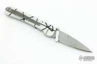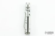 This side-opening automatic by Rob Dalton features a bead blast blade with swing guard and an anodized silver and black aluminum frame. Bead blast titanium clip. Push button coil spring opening. Has a few light scuffs/scratches, otherwise excellent condition. #143