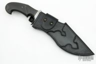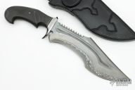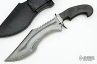 This "New Black Bull" by Claudio Sobral features a forged San Mai Damascus blade (420/1095 steel) with fullers, sawteeth on the spine and false top edge, .255" blade stock and 2.750" blade depth, hidden/mortise tang construction. The handle has a stainless steel guard, nicely figured carbon fiber grip with black canvas micarta and nickel silver spacers, polished and domed steel pin, black canvas micarta frame. Comes with a beautiful hand tooled black leather sheath and a leather zippered case. New from maker.