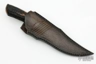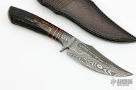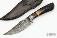 Another absolutely stunning piece from the Sobral brothers! This Hummingbird features a Damascus clip point blade with false top edge and deep fullers, .250" blade stock and 1.510" blade depth, hidden tang construction. The guard is integral to the blade, with a beautiful stag grip, nickel silver and canvas micarta spacers. This piece comes in an equally impressive, hand tooled, brown leather sheath and a leather zippered case. New from maker.
