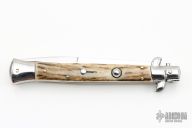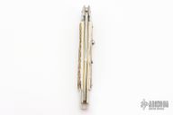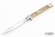 This 11" Picklock by Frank Beltrame features a polished bayonet ground 4mm blade with false top edge. The handle has stainless steel bolsters, front and rear, stag scales, brass liners, stainless spring. Includes a leather slip sheath.  Excellent condition.