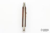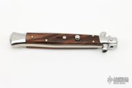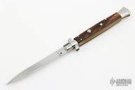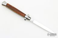 This 11" swivel bolster by Frank Beltrame features a polished drop point 4mm blade with false top edge. The handle has nickel silver bolsters, front and rear, wood scales, brass liners, stainless spring.   Includes a leather sheath.  Excellent condition. This one was polished and tuned by Greg Effects.