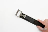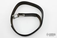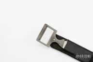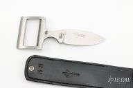 This is a belt buckle knife by Bowen USA. Has a double edged dagger blade, .170" blade stock and .991" blade depth, integral construction. Comes with original box and a black leather 38" belt. Excellent condition.