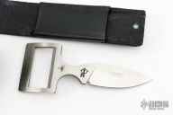 This is a belt buckle knife by Bowen USA. Has a drop point blade, .170" blade stock and .991" blade depth, integral construction. Comes with original box and a black leather 36" belt. Excellent condition.