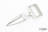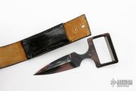 This is a belt buckle knife by Bowen USA. Has a double edged blade, .170" blade stock and .991" blade depth, integral construction. Comes with original black leather 38" belt. Has some light scratches, otherwise excellent condition.