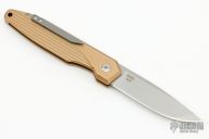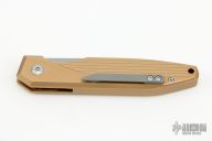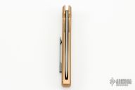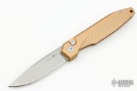 This push button auto features a stonewashed drop point blade.  The handle has a gold aluminum frame with a bead blasted tip up pocket clip.  Includes the original box and a leather slip sheath. Light scuffs are visible on the pocket clip otherwise the knife is in Excellent Condition.