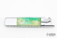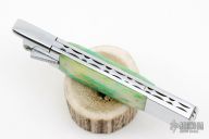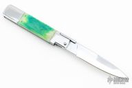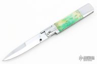 This Picklock Auto by Armenian Doctor Knives features a mirror polished bayonet ground blade with a false top edge. The handle has a polished stainless steel frame with fileworked stainless steel backspacer, dyed bone scales with brass pins. New from maker.