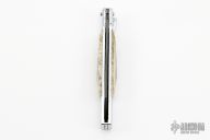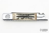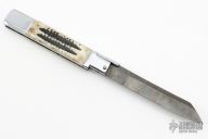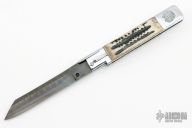 This Picklock Auto by Agasi Hambartsumian of Armenian Doctor Knives features a Damascus blade with a false top edge. The handle has a polished stainless steel frame with fileworked stainless steel backspacer, jigged bone scales with brass pins. New from maker.