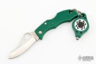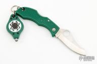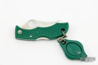 This Jester by Spyderco features a satin finished blade with thumbhole and notched thumbrest. The handle has green FRN scales, stainless steel backspacer, lanyard hole with Spyderco flashlight attached. Comes with original box and papers. Excellent condition. Rare and discontinued.