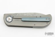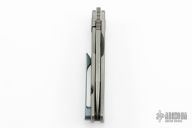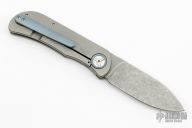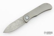 This EXK SFL from Burger Knives features a tumble finished drop point blade with notched thumbrest and front flipper. The handle has a bead blasted and milled titanium frame with anodized tip up clip, collar, and backspacer. Includes a zippered case and COA. Excellent Condition.