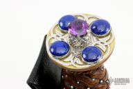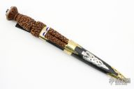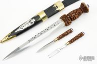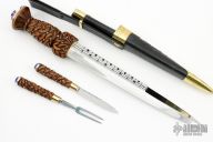 This Large Sgian Dubh by Blade Catcher features a mirror polished blade with false edges, fullers and fileworked spine, .250" blade stock and 1.483" blade depth, hidden tang construction. The handle has a brass guard and a carved wood grip with silver pin inlays, brass butt plate with silver overlays with lapis stones and a large amythest. Comes with a brass and black leather scabbard with a silver overlay. The sheath also holds a matching knife and fork. Has some light scratches, otherwise excellent condition. Really nice piece with a lot of detail.