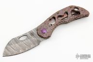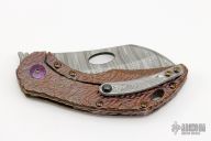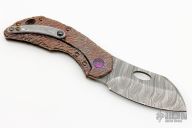 This Busker Largo (02/50L), by Olamic Cutlery, features a Damasteel blade with thumb hole and front flipper. The handle is comprised of a sculpted and anodize finish titanium frame with matching backspacer. Tip up Damasteel clip. Lanyard hole in pommel. Includes original padded case and makers card dated 04/8/2019. Excellent condition.