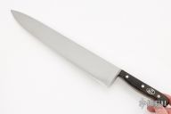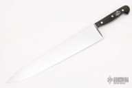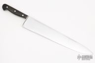 This Chef's Knife by Gustav Emil Ern features a satin finished blade .155" blade stock and 2.450" blade depth, full tang construction with integral bolsters, dark wood scales. Comes with original box, although it is in pretty rough shape. Has a few light scratches, otherwise excellent condition.