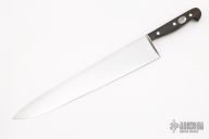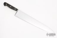This Chef's Knife by Gustav Emil Ern features a satin finished blade .155" blade stock and 2.450" blade depth, full tang construction with integral bolsters, dark wood scales. Has a few light scratches, otherwise excellent condition.