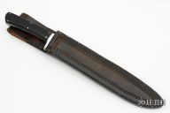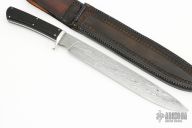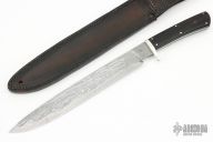 This knife by Dragonfly Forge features a San Mai Damacus blade with English Shear Steel core and cable Damascus clad, .255" blade stock and 1.305" blade depth, full tapered tang construction. The handle has a nickel silver guard with dark wood scales and nickel silver pins. Comes with a hand tooled brown leather sheath. Has a couple light scratches, otherwise excellent condition.