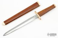 This Dagger by Dragonfly Forge features a Cable Damacus double edged blade with .235" blade stock and .936" blade depth, hidden tang construction. The handle has a bronze guard and butt with a wood grip. Comes with a matching wood scabbard with bronze collar and walrus ivory tip. Excellent condition.