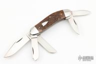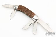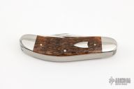 This slip joint by Terry Davis features hand rub satin finished blades with nail nicks. The handle has stainless steel bolsters with integral liners, stainless steel springs, jigged bone covers with a stainless steel escutcheon. Comes with a zippered case. Excellent condition. Dated 1997.