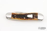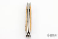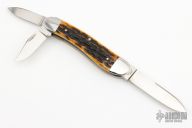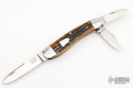 This slipjoint by Terry Davis features hand rub satin finished blades with nail nicks. The handle has stainless steel dovetailed bolsters with integral liners, stainless steel springs, jigged bone covers with a stainless steel escutcheon. Comes with a zippered case. Excellent condition. Dated 1990 and #162 under the ricasso of the main blade.
