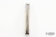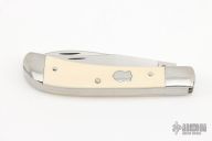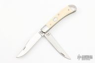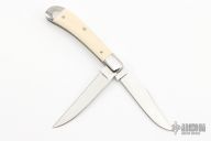 This 2-Blade Trapper by Dan Burke features hand rub satin finished blades with nail nicks. The handle has polished stainless steel bolsters, mammoth ivory covers with a stainless steel escutcheon, stainless steel liners and spring. Includes a padded zippered case. Excellent condition.