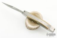 This slipjoint by Bill Simons features Damascus blades with nail nicks. The handle has stainless steel dovetailed bolsters, mammoth ivory covers, fileworked stainless steel liners and stainless steel springs. #258 inside the spring. Comes with a zippered case. Excellent condition.