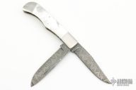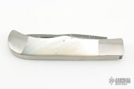 This 2-Blade Trapper by Murray Sterling features Damascus blades with nail nicks. The handle has dovetailed stainless steel bolsters with integral liners, mother of pearl covers, stainless steel liners and springs. Has half-stops, flush in all positions. Excellent condition. Comes with a zippered case.
