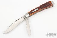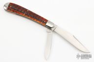 This full-size 2-blade HTT Bullet Knife by Tony Bose features hand rub satin finished blades with long pull nail nicks. The handle has stainless steel bolsters, liners and springs with jigged bone covers and a stainless steel bullet escutcheon. Comes with a zippered case. Excellent condition. #3