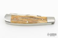 This slipjoint by Bill Simons features satin finished blades with nail nicks. The handle has stainless steel bolsters, mammoth ivory covers, stainless steel liners, and stainless steel springs. #383. Excellent condition. Comes with a zippered case.