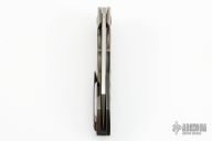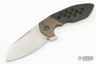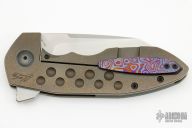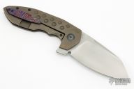 This Capitalist flipper from Custom Knife Factory features a light bead blasted blade with a false top edge. The handle features a tumbled titanium frame with orange peel finished titanium scale and backspacer. Black Timascus tip up pocket clip. Includes padded case, extra hardware and COA.  Excellent Condition.