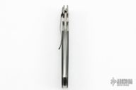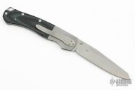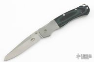 This Top Lock folder by Warren Osborne features a bead blast finish blade with dual checkered thumbstuds. The handle has bead blasted stainless steel bolsters with integral liners, black/green G-10 scales, stainless steel locking liner and backspacer. Numbered 004 on black of blade. Bead blasted tip down steel pocket clip. Excellent Condition. Very cool locking mechanism, its an early compression lock. Comes with a zippered case.
