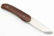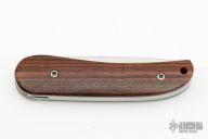 This liner lock folding knife is a Denis Lemaire design, it features a satin finished drop point blade. It has a patented opening function that has a knurled rotary button that can be opened easily and in a variety of ways, has wood inset and wood scales. Stainless steel liners and backspacer. Blade Steel: Sandvik 12C27. Comes with zipper case. Has some light scuffs and scratches, otherwise great condition.