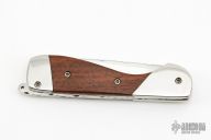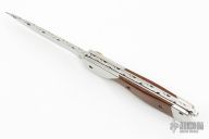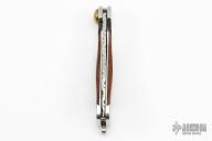 This Scale Release Auto by Center Cross Metal Works features a mirror polished blade with fileworked spine. The handle has dovetailed stainless steel bolsters and liners, wood scales, stainelss steel fileworked backspacer with lanyard bail. Has some scratches and minor blade play, otherwise good condition.