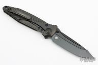 This Socom Bravo by Microtech is made in China by Rike Knife, it features a black blade, notched thumbrest, and dual thumbstuds. The handle has black titanium bolsters/liners, black pivot collars, carbon fiber scales. Tip up carry black titanium clip. Black titanium backspacer. Comes with original box and papers. Excellent condition.