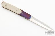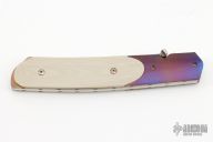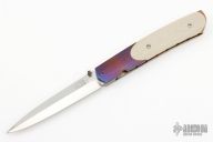 This Assisted Opening Linerlock by SM (please let us know if you know who this maker is) features a hand rub satin finished blade with false top edge and a single thumbstud. The handle has anodized titanium bolsters, tan G-10 scales, fileworked and anodized titanium liners, stainless steel backspacer. Nice detent, action, blade seating and lockup. Excellent condition.