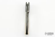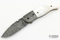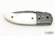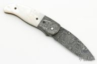 This Assisted Opening Linerlock (please let us know if you know who this maker is) features a Mosiac Damascus blade with a single thumbstud. The handle has matching Damascus bolsters, mother of pearl scales, titanium liners, Damascus backspacer/spring. Nice blade seating and action, but, the lockup doesn't work, the liner slips when it is open, so it does not lock. Also, because the spring is strong, the blade bounces back when it is fired. It is a beautiful knife, but beautiful materials, but it doesn't function properly, otherwise excellent esthetic condition.
