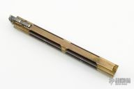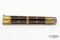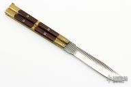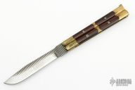 This Balisong by Pabu Knives features a clip point blade with notched thumbrest. The handles are brass c-channel construction with cocobolo inlays, and a brass T-latch in pommel. Has some light scratches and patina, otherwise excellent condition.