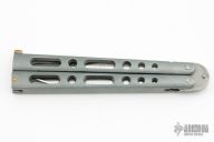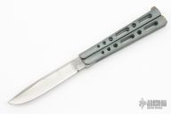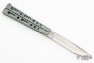 This Balisong by Pabu Knives features a spear point blade with notched thumbrest. The handles are C-channel construction, and a T-latch in pommel. Has some light scratches and scuffs, otherwise excellent condition.