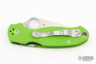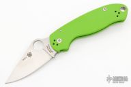 This Para 3 by Spyderco features a satin finished clip point blade with thumb hole and notched thumbrest. The handle has green G-10 scales over nested steel liners and stand-offs. The steel pocket clip is 4 way adjustable. Includes original box and papers. Excellent condition.