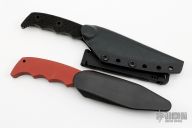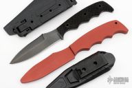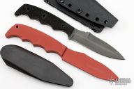This Dynamis Alliance fixed blade was crafted by Daniel Winkler. IT features a spear point blade with sharpened top edge and notched thumbrest. The handle is comprised of laser engraved rubber scales over full tang construction. Jimping on pommel provides purchase when holding in the reverse grip. Includes a molded plastic sheath with metal clip. Includes red anodized aluminum trainer and a custom kydex sheath. Excellent condition.