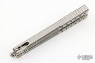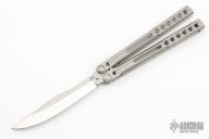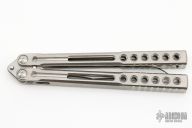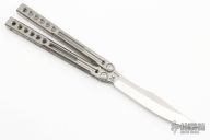 The Invictus Balisong features a stonewashed blade.  The handles are anodized 6AL-4V titanium with a latchless channel construction design, bushings, phosphor-bronze washers, and hardened steel tang pins.  S/N 125.  Includes original box and COA. New from maker.
