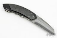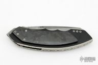 This Linerlock Flipper by Corrie Schoeman has a San Mai Damascus blade with fileworked spine/flipper and flase top edge. Handle has brass Fat Carbon scales over black G-10 and fileworked titanium liners, and titanium backspacer. Nice blade seating, lockup and detent. New from maker. Comes with a zippered case and COA dated Jan 2023.