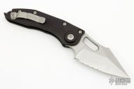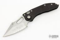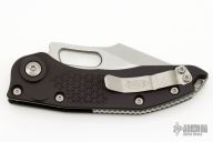 This Stitch Auto by Microtech Knives features a stonewash finished blade and false top edge, notched thumb and finger rests. The handle has a black milled aluminum handle with a bead blasted titanium backspacer and a bead blasted stainless  steel clip, tip up carry, lanyard hole at the butt. Comes with original box and papers. S/N of 10912 and dated 09/2022. New condition.