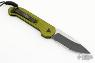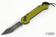 This LUDT side opening automatic from Microtech has a two-tone black finish blade with a partially serrated edge and a contoured OD Green aluminum frame. Stainless steel clip. Dated 01/2023 and serial number 29379, comes with original box. Excellent condition.