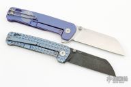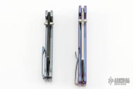 This QSP Penguin has a black tumbled sheepsfoot 154CM blade with dual thumbstuds. The handle has milled titanium frame with a matching tip up pocket clip. Comes with original box and papers. Excellent condition. Specs below are for this knife.