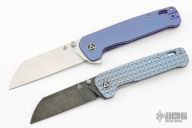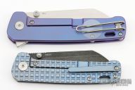 The QSP Penquin Plus has a satin finished sheepsfoot 20CV blade with dual thumbstuds, notched thumbrest and flipper. The handle has an anodized titanium frame with a stainless steel tip up reversible clip. Comes with original box and papers. Excellent condition. 3.25" blade 7.875" overall 4.5" closed.
