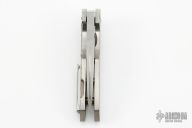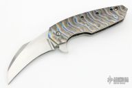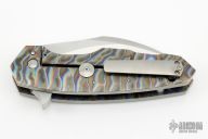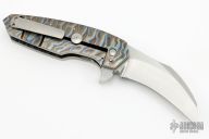 This Monster Fatty Kobra Flipper has a satin finished blade with flipper, .360" blade stock. Handle has .250" thick flamed titanium with satin stainless steel standoffs and a titanium clip positioned for tip up carry. Nice detent and blade seating. Comes with a leather zippered case. Has some light scratches and a little tiny bit of vertical blade play, clip screws are marred up, otherwise excellent condition.