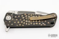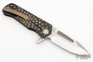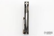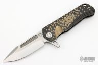 The Proxima started life as the Gigantes. For folks that wanted a larger than life knife it was awesome, but for the rest of planet Earth an adjustment in attitude was required. We drew-down the overall length to 8.8″ with a 4.9″ closed length for the pocket and 3.9″ blade length. All materials are of 3/16″ nominal stock, making for a very EDC friendly thickness. We played with several twists on the original name but as the prototype was carried by Greg, he kept saying, This knife is too awesome to get a spin-off name. Since every time anyone needed to look at the prototype it was in Greg’s pocket… always near, thus: Proxima. This is THE knife carried by Greg these days. As he says: I love the flipper/hilt and the basic meanness of this thing! It just looks bad ass and I look for reasons to snap it out all day What else can we say? This one has a tumbled S35VN blade with fullers, notched thumbrest and flipper. The handle has a anodized and carved titanium frame with a tip up titanium clip. Excellent condition.