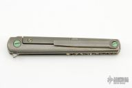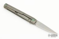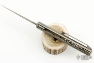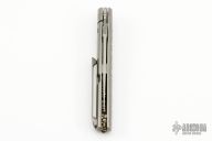 This MS3 Manhattan Special by Michael Zieba features a blasted blade with notched thumbrest and flipper. The handle has a tumbled titanium frame with matching tip up clip and anodized titanium hardware, has stainless steel lockface insert, cast brass backspacer with skulls. Rides on bearings, nice detent, lockup and blade seating. Excellent condition. Comes with a zippered case and COA dated 03-09-20